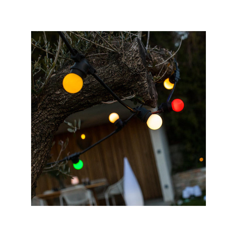 Finally, this guinguette garland measures 6.5 m in total. It includes a bulb every 30 cm and the distance between the socket and the first bulb is 3.5 m. Additionally, it is protected against splashes and also UV resistant.