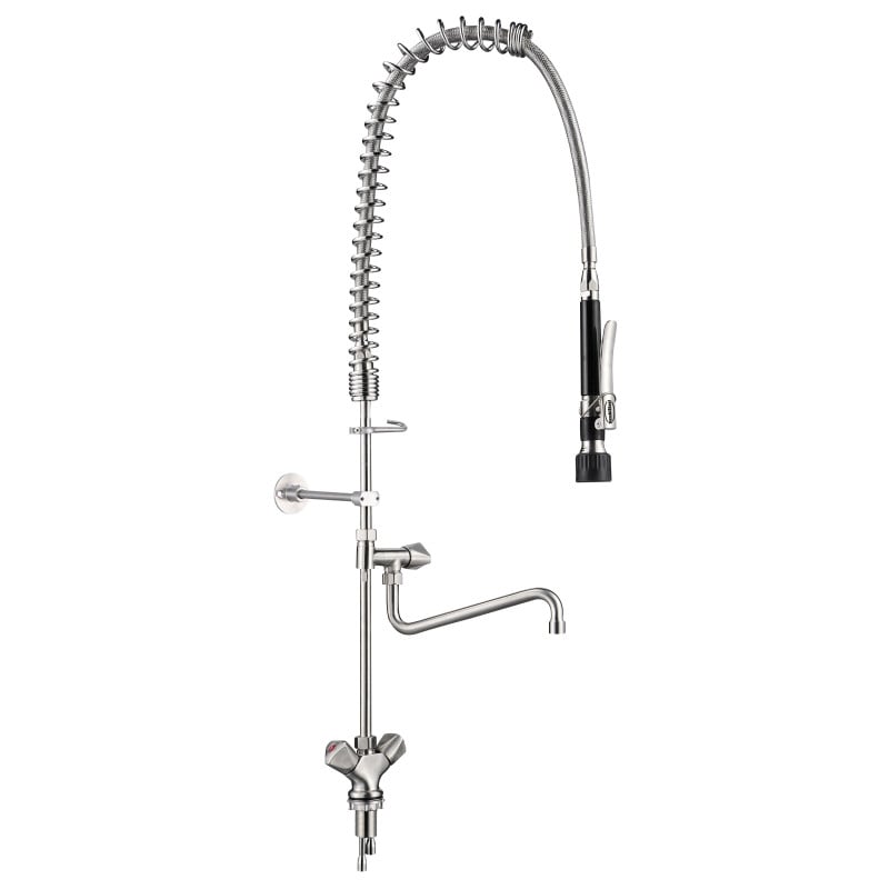 This professional pre-rinse unit large model with single-hole swan neck faucet is adjustable for daily use. This shower head is made of stainless steel with adjustable wall mount.