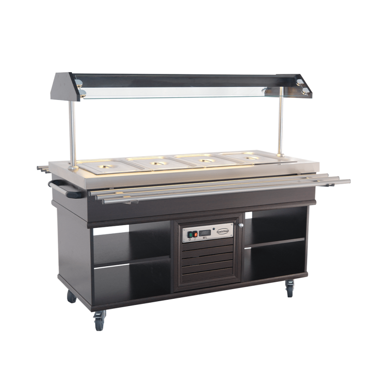 Équipé d'une technologie de chauffe par bain-marie, le chariot maintient les aliments à des températures contrôlées, variant de 30°C à 90°C. Cette plage de température garantit non seulement la qualité gustative des plats mais aussi leur sécurité sanitaire. Le système d'éclairage intérieur LED met en valeur les mets, captivant l'attention tout en facilitant le choix des options par les invités.