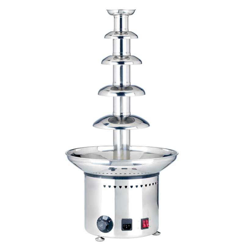 Dotée d'un bol de 370 mm de diamètre et de 6 cascades, cette fontaine à chocolat permet de satisfaire jusqu'à 150 convives. Elle est en acier inoxydable est équipée d'un puissant moteur et d'un bouton de réglage de la température pour un chocolat maintenu à la bonne température. Son design esthétique permet de s'intégrer à tout style de réception et sa température est réglable de 0 à 150 °C .