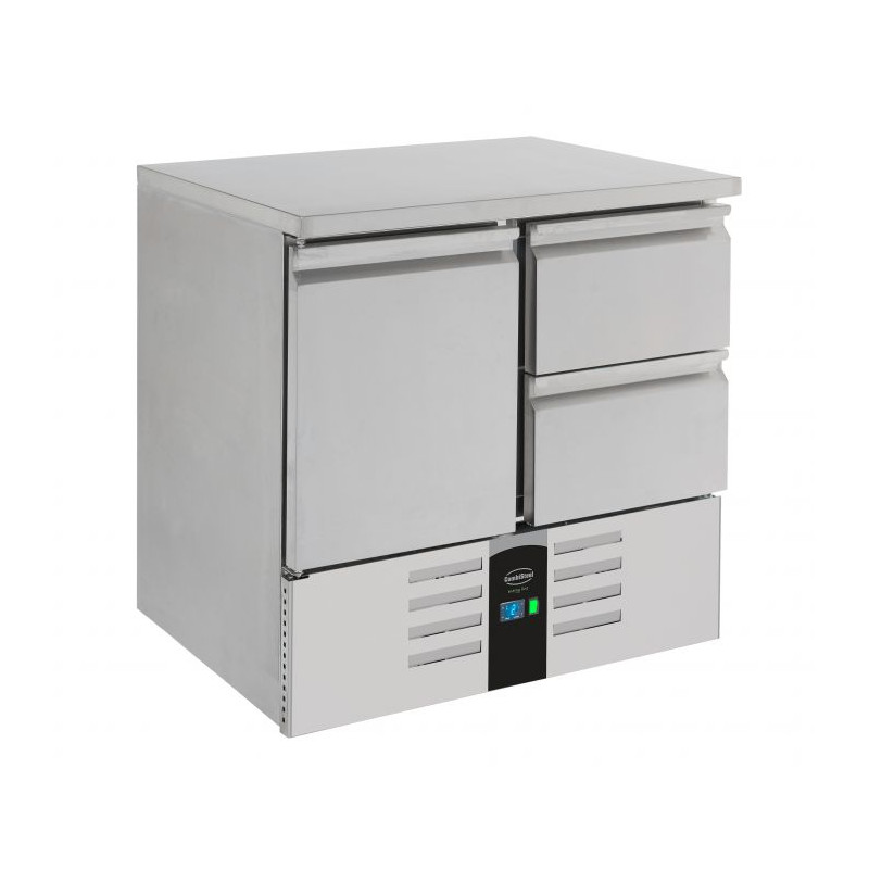 Cette table est équipée de quatre tiroirs spacieux de type GN 1/2, chacun pouvant être utilisé pour stocker divers types d'ingrédients séparément, facilitant ainsi l'organisation et l'accès rapide aux produits nécessaires. La plage de température, allant de 2°C à 8°C, permet de garder les aliments à une température idéale, garantissant ainsi leur fraîcheur et leur qualité. De plus, le système de refroidissement statique assure une répartition homogène de la température sans dessécher les produits stockés.