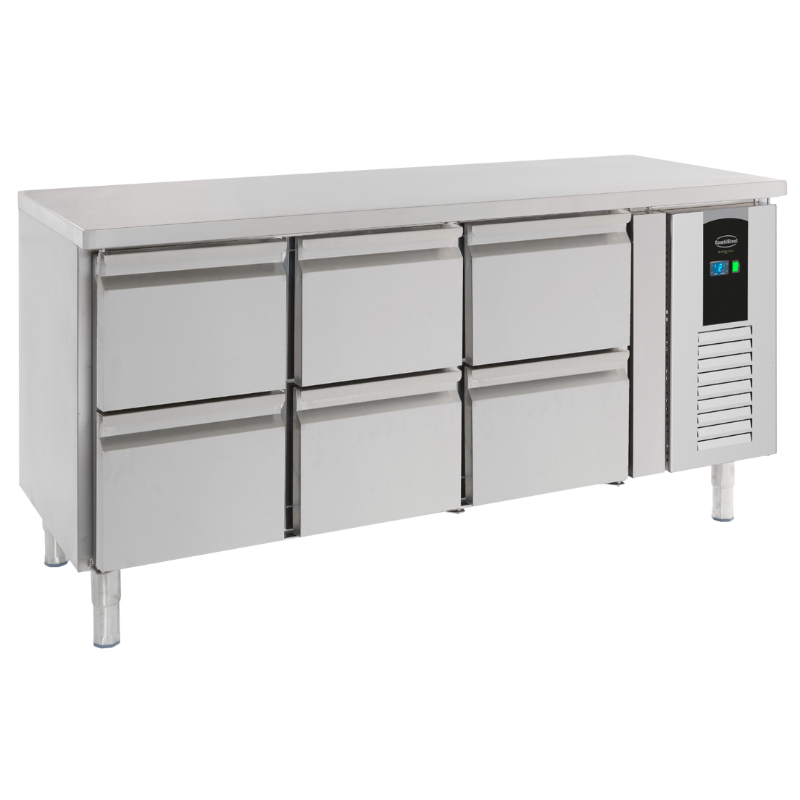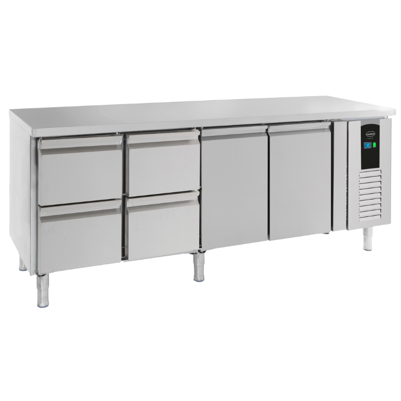 Utrustad med 9 rymliga lådor i format GN 1/1, underlättar detta kylbord organisering och förvaring av ingredienser. Varje låda är utformad för att bibehålla fräschör och säkra produkterna vid en konstant temperatur mellan 0°C och 10°C, tack vare ett ventilerat kylsystem. Detta säkerställer en jämn fördelning av kylan, vilket är avgörande för att bevara livsmedelskvaliteten och uppfylla de strängaste livsmedelssäkerhetsnormerna.